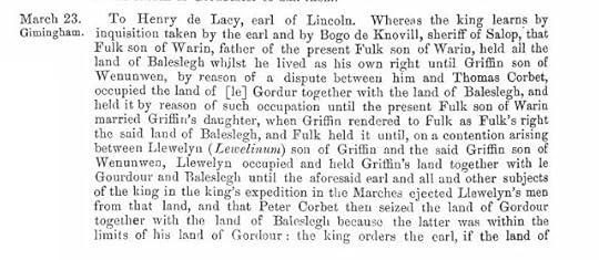 The land-hungry Marchers now turned on each other: unity of purpose only lasted until these boys got their sweaty mailed mittens on some lovely green acres. Fulk Fitzwarin, lord of Whittingdon, claimed he should have Bausley. His father had held the manor until Gruffudd ap Gwenwynwyn seized it, and then Fulk recovered it by marrying Gruffudd’s daughter. Llywelyn had then seized the manor from Gruffudd, until the king’s army ejected Llywelyn and the land was taken by Peter Corbet, another Marcher. Simple.