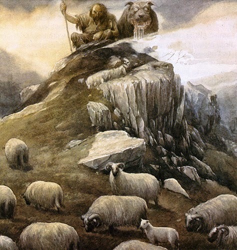 The giant shepherd in Culhwch and OlwenSurreal, offbeat imagery permeates the earlier Welsh tales of Arthur, conjuring up a very different atmosphere to the courtly environment of Malory. There is something wild and untamed about Arthur's men, who appear more supernatural than human, capable of extraordinary feats of strength. In The Dream of Rhonawby, a furious Arthur crushes a set of golden playing pieces to powder in his hands, and laughs in contempt at the 'scum' and 'little men' who are left to defend Wales after he has gone. A giant-slayer, he is himself a giant, the matchless Amheradwyr or Emperor, whom no other Welsh/British hero can measure up against.And then there is ultimate surrealism of the Cauldron of Annwn, but that shall be for another post....