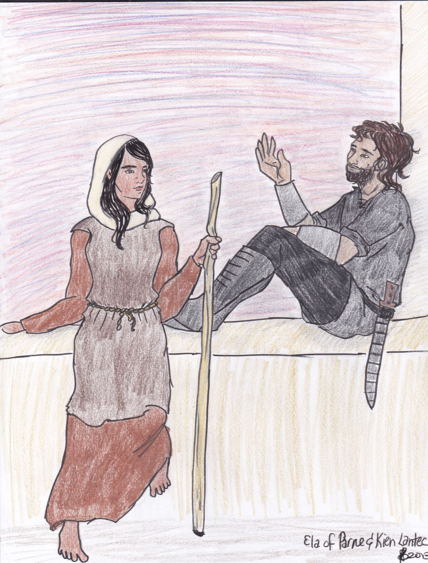With my landscapes and beasts all sketched, I imagined my characters. People who might have lived during my imaginary world’s Biblical era. What did they eat? What did they drink? What sort of clothes did they wear? Were there variations in language and clothes between each country? I drew upon my knowledge of ancient lands, and my personal library of history books and decided upon the “look” for my characters, as well as their manners and customs. This world, I decided must be primarily Biblical in flavor, with hints of Earth’s own ancient cultures—leading to more research for details I loved and added to my story. To clothe my characters, I sought colorful examples from our own world. Who knew that the exotic saris of modern India were inspired by garments from ancient Greece?