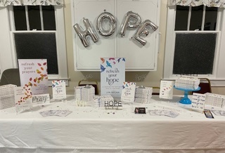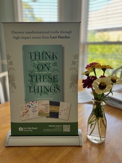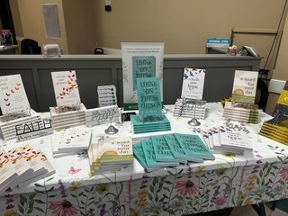 The pictures in the post above are those someone took of my table at a recent women’s ministry event to give you an idea of some of the elements I’ve shared here. (Yes, the event had a theme, so I used the tablecloth they supplied.) You’ll notice decorative items that support the themes of my books, a business card holder to share my contact information, and a stand-up price list for easy shopping.