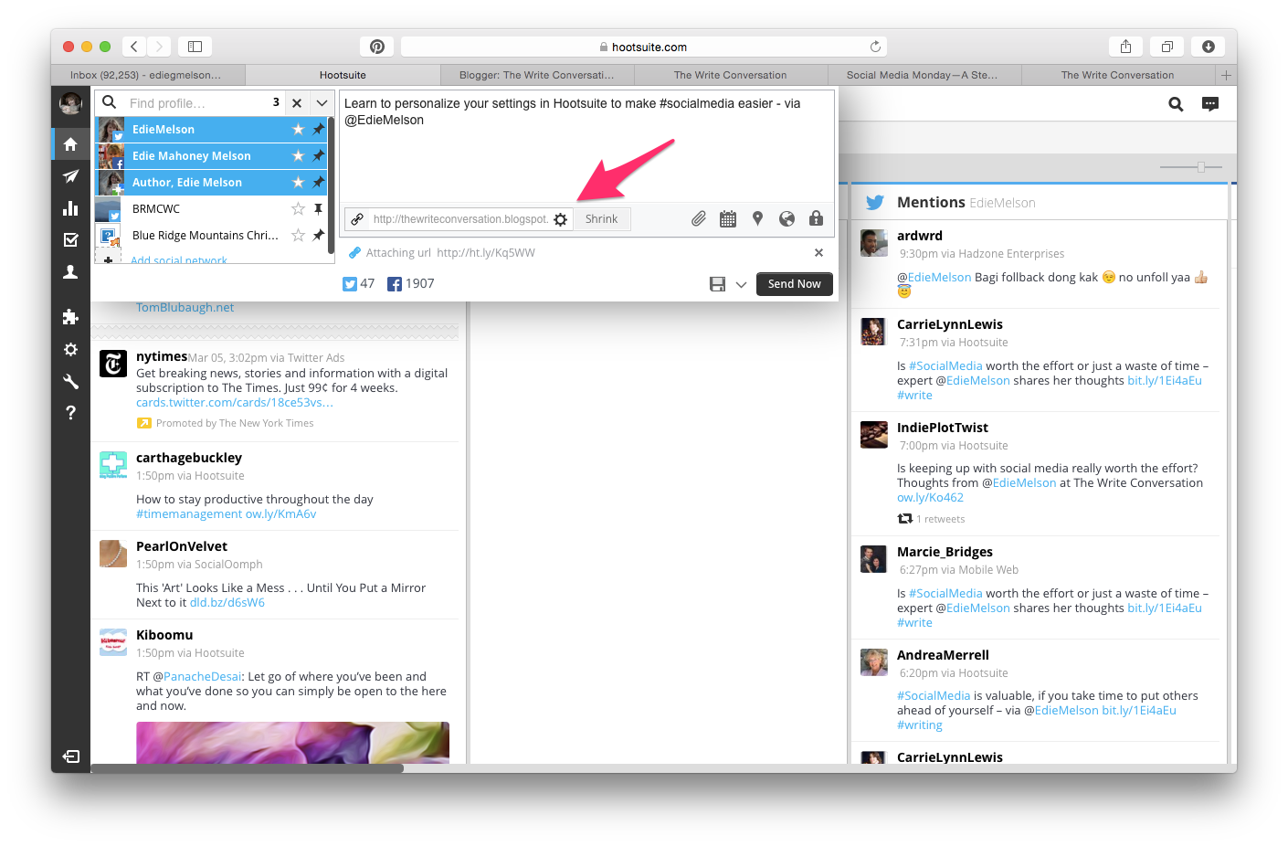 Finally, you can see to the right of the drop down menu, one of my Hootsuite columns titled, Scheduled Tweets. This is where all my Tweets for the day are listed. As you can see, they’ve all gone out for today already.