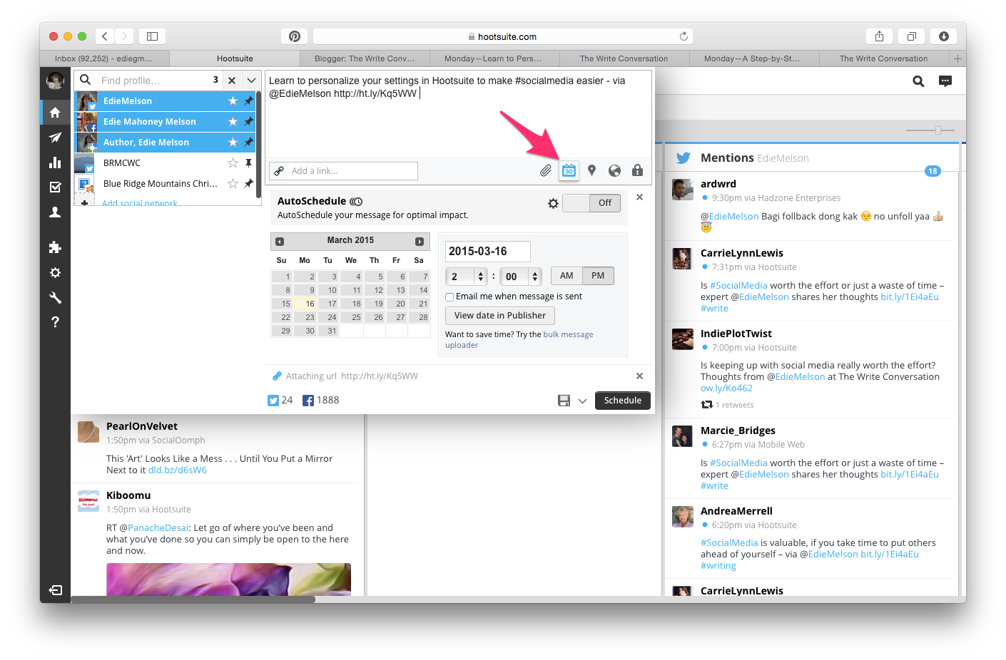 Here is step by step how I schedule Tweets and Facebook Posts in Hootsuite.