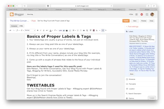 Here are the labels/tags I used for this specific post:Edie Melson, The Write Conversation, Get Your Blog Found with Proper Labels & Tags, Blogging for Writers, Successful SEO, Social Media Monday