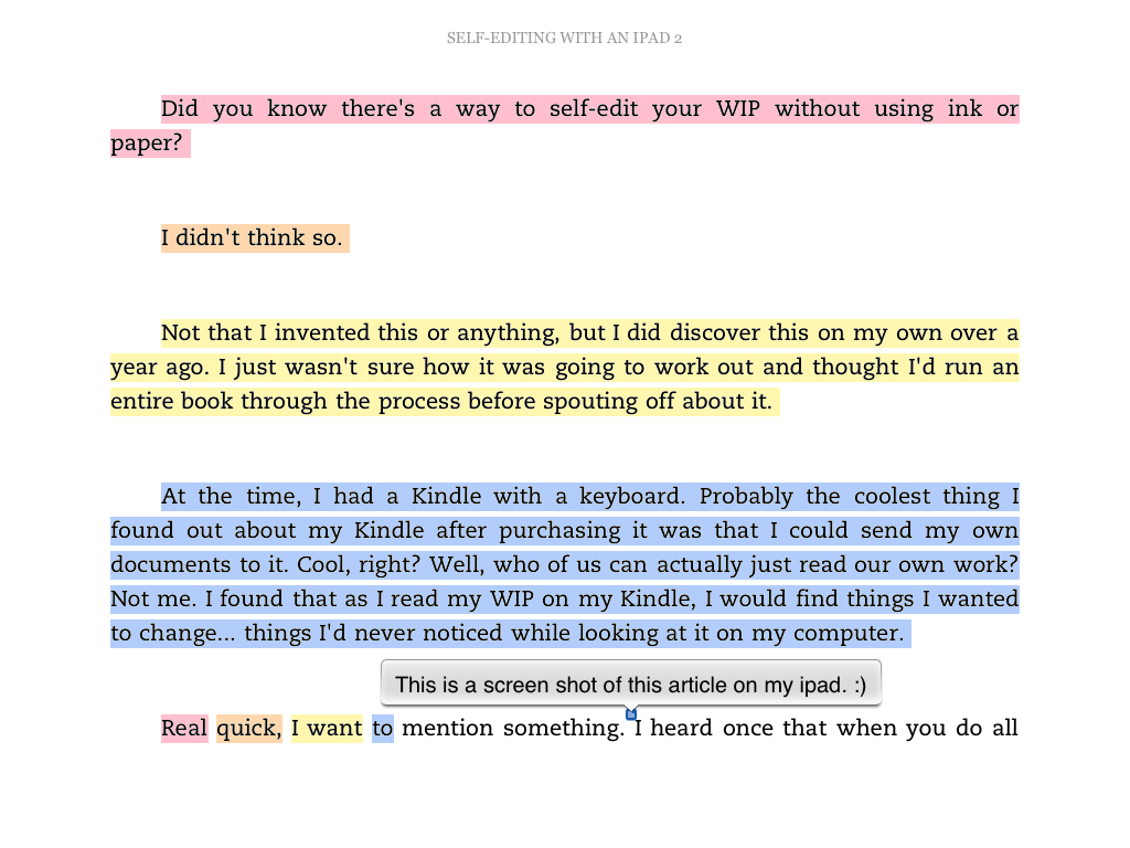 5) TO SEND: Go to your email account. Type in your Kindle email address, attach the document file you want to read or edit and push send. Easy. :)I’ve never considered myself a very technologically-advanced person, but once I realized the possibilities of what the Kindle could do to help with my writing career, I worked hard until I figured it out. I live by this one-chapter-at-a-time process of editing from my iPad now and use it to edit and polish through every book I write.