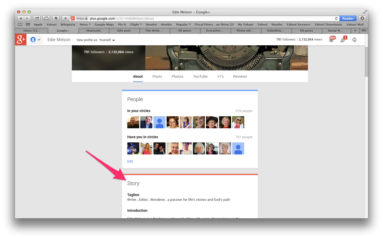We’ll begin with STORY. You’ll want to come up with a short tagline that describes who you are. I use the same one on all my networks, to help people find me (see screenshot below).