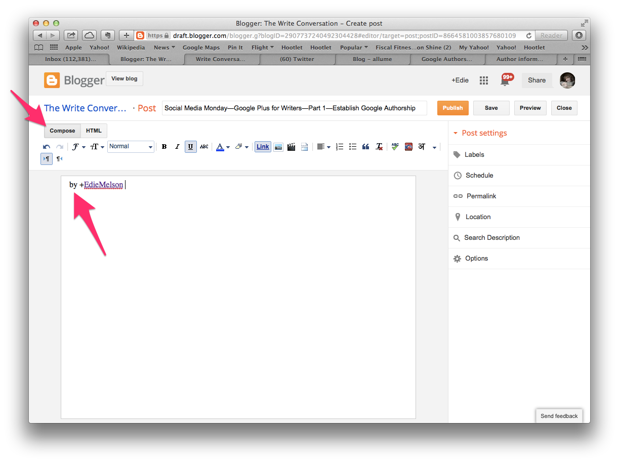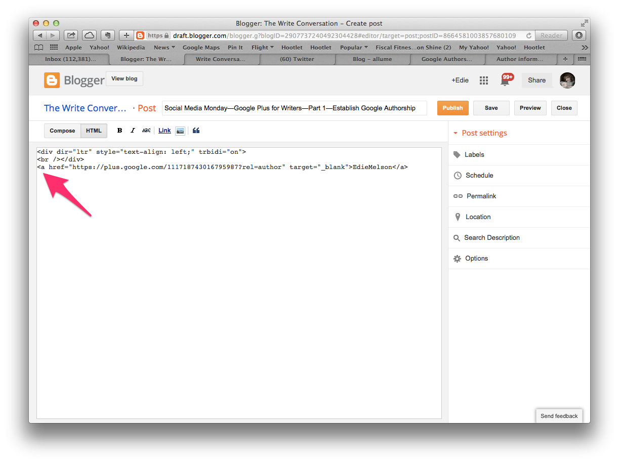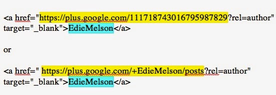 Edie's Third WayI have discovered a work-around for this second option that doesn’t require delving into the inner workings of my blog. If you look at the top of this post, you’ll notice my byline (By +EdieMelson @EdieMelson) in both instances, my name is a hyperlink. The first is a link to my Google+ profile and the second is a link to my Twitter profile.