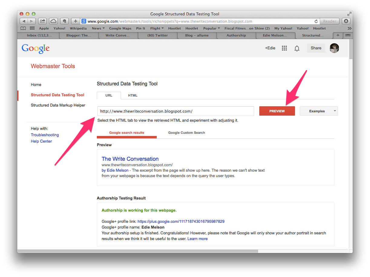 6. The last thing you’ll want to do is verify that your Google+ authorship is working. Visit this site, plug in your blog’s URL and click PREVIEW (see screenshot below). This will only work once you have PUBLISHED the post with your Google+ link. It won’t work until you have published your blog.