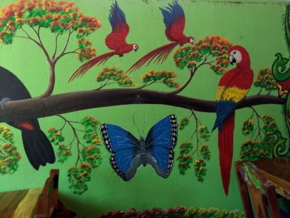 This is a photo I took of a mural in a small cafe in Costa Rica. It’s prettier than the one I took of a coffee plant. We visited a small cooperative coffee plantation where I learned that dark roast coffee has the least caffeine. Maybe I’d been told before, but most of our tour groupies seemed surprised, too. We also tasted a great coffee liqueur. So don’t say I’m not always learning and willing to share my lessons!