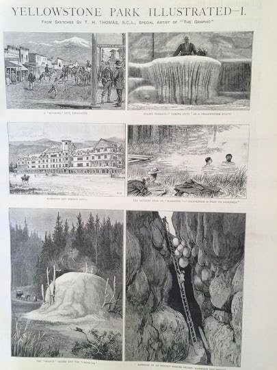 My iPhone shot shows a page from the August 11, 1888 Graphic. You see three scenes engraved from photographs: Livingston, Montana; Pulpit Terrace at Mammoth; and the Mammoth Hot Springs Hotel. One engraving is from a pencil sketch and two from watercolors: Bath Spring, Orange Spring Mound, and the interior of Devil’s Kitchen.