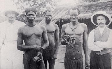 Congolese men pose with the severed hands of others who failed to produce rubber for their Belgium enslavers