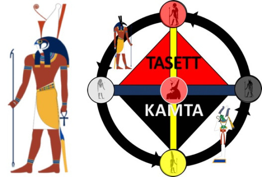 Hru Aakhuti (Horusakhte) represents the Superconscious’ mysterious ability to protect, defend and clear the road that Npu opens of obstacles. Since he is the forger of iron, which can be used as a tool or weapon, he represents both creativity and violence and controls life and death. His colors are blood red and purple.