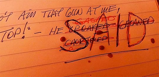 How boring. The next book I read about writing also told me I needed to use ‘said’, but this time, the author explained why ‘said’ is so important, and it sunk in. Sunk in deep. Now when I see any tag other than ‘said’, the red pen strikes it out like it’s a cancer. Said is the best tag. If you think of a better tag than said, use said anyway, it’s still better.