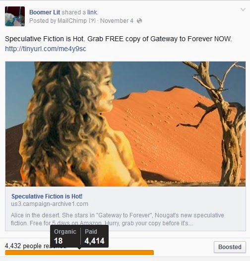 I did try to advertise on Facebook. I boosted a post written under my alter ego on Facebook (I'm that blue guy called Boomer Lit - the logo of my Goodreads group that I set up two years ago to discuss Boomer Lit and that has now over 500 members). It had 18 "organic likes" before I boosted it (at a cost of $40) and a day later, on the fourth day of my free book campaign, it had over 4,400 "likes", see the screenshot I took showing the result: