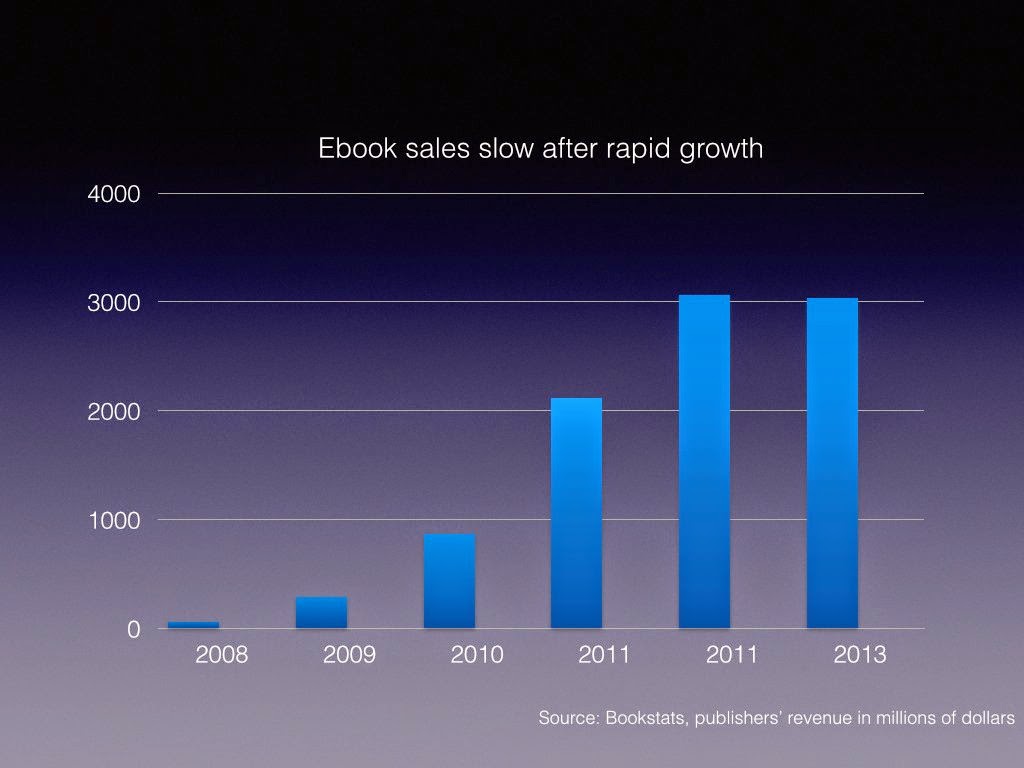 Actually 2014 had started on the heels of a lackluster year for the e-book market. Here is a chart that shows sales revenues from e-books since 2008 (remember, the starting point was November 2007 when Amazon launched the new publishing digital age with its famous first Kindle sale):