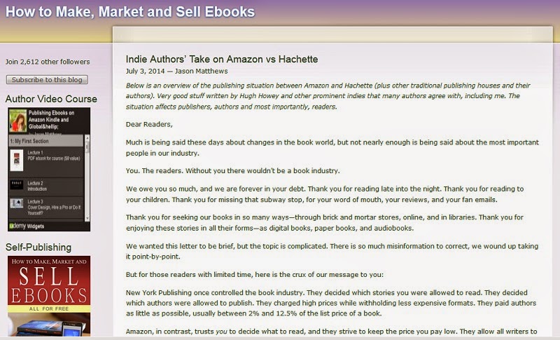Indie writers, and that means "self-published authors", are up in arms over the Amazon-Hachette spat, all rushing in the defense of Amazon. For a perfect example of the sort of blog post siding for Amazon, see here (or link to it here):