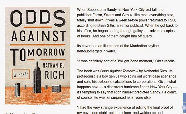 Dan: Good! I was hoping for a headline mention of cli fi in the NYT, but in the PR business one cannot control how headlines are written or even how news articles are written. But the Times article was very important and for one special reason: cli fi has now been mentioned in the newspaper of record, The New York Times. That's a first. This is the beginning. There is no stopping the rise of cli fi novels now.