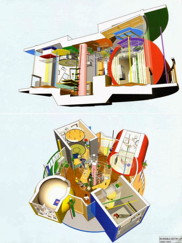 I don't know about you, but all this got me thinking about life and art. Madeline and her husband, in their own peculiar way, were a formidable success putting together the basic tenets of Conceptual Art and Architecture, ending up with a radicalized view on architecture. Their views were expounded in an exhibition at the Guggenheim Museum SoHo in 1997 in New York and they managed to get several projects off the ground, including what is probably the best known one, the "reverible destiny lofts" in Mitaka, Japan. Based on a concept where there are no doors to delimitate rooms, space is defined through abutment and angles: