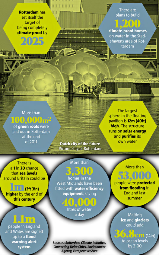 There are basically two solutions, see here: floating houses and houses on stilts. But the Dutch are an inventive sort, they've already come up with a climate proofing model for one of their major cities, Rotterdam, already under sea level. And the British are showing that they are worried too and are not that far behind: