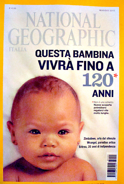Is the dream of a long and happy life within reach? The National Geographic recently published an article about the progress of science in this area and optimistically slapped a baby face on its cover suggesting that your child might live to be 120 years old (see photo, that's the Italian edition I get here, if you want to read the full article in English, click here).