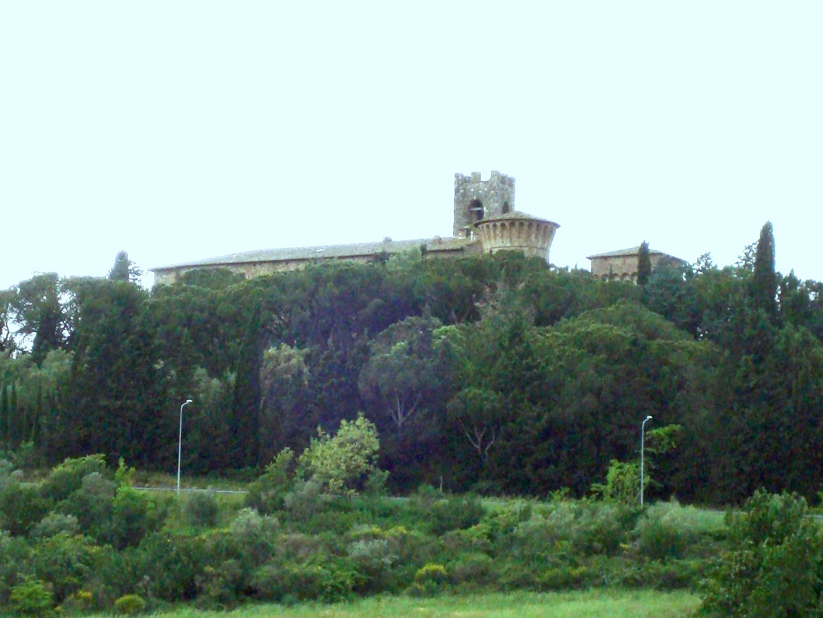 The castle is in Magione, here it is, a medieval fortress that belongs to the Order of Malta, rising darkly on its tree-covered hilltop: