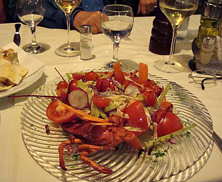 What to eat? Pasta of course, or risotto or pizza, all excellent. We decided on a simple pizza Margherita (just tomatoes and mozzarella with fresh basilico to flavor it) and followed it with an "Astice alla Catalana" - a delicious lobster covered with plenty of crunchy vegetables: