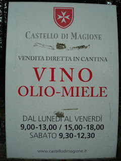 To the left, the sign tells you what they sell - wine, olive oil and honey - and the opening hours: