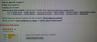 Is the other major search system proposed by Amazon, the one based on "average customer review" of help in book discovery? One problem, as mentioned above is that the criteria used to define the category is not clear. The second and bigger problem is that the top 100 slots are solidly occupied by books with reviews in the thousands - clearly titles that have been "popular" for quite a while and are selling accordingly. In a sense, while the books are not ranked in the same order as the top 100 in "paid in Kindle Store", the list is a duplicate and doesn't help in book discovery. It's not cool.
