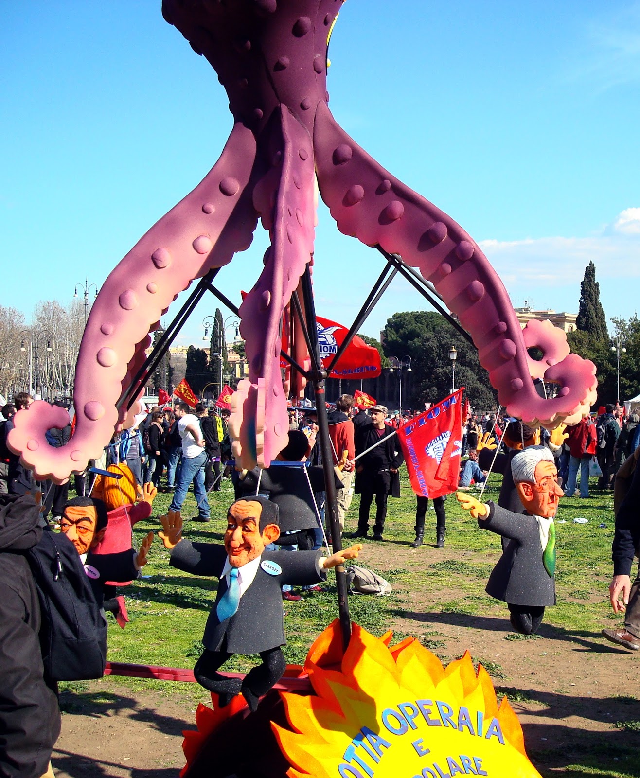 People certainly had fun preparing for it, some even did a purple octopus holding onto puppets of politicians (Monti is on the right):