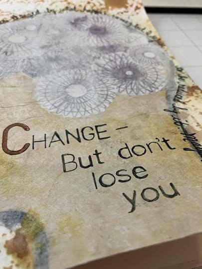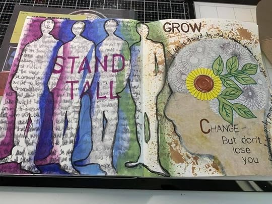 In an art journal, you can allow spinning chaos, and confusion to slowly turn into a pretty yellow flower with a green stem. When we step back and look at the bigger picture we realize that underneath all the people we’ve been (and are becoming,) all things we’ve had happen to us, we are not reduced in size, just changed over time.