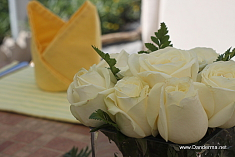 Beautifully set with colorful linen and fresh white roses which are my favorite flowers of all time.