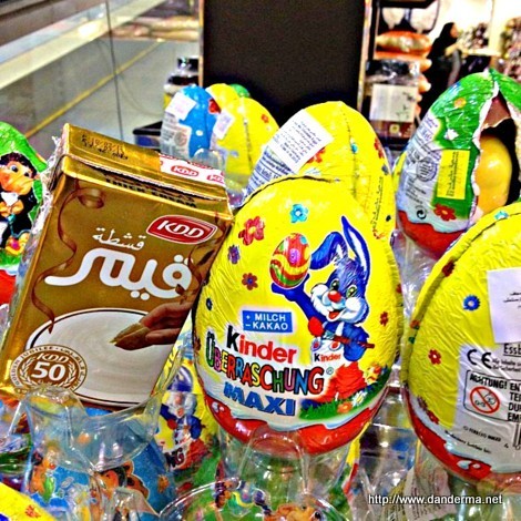 Yesterday I was in Mishref Co-op when I found a plastic tray filled with huge Kinder eggs each one as big as a big KDD Qaymar carton. One of the Kinder eggs was cracked open and we could see that inside its the old Kinder egg with a huge capsule for the gift inside.