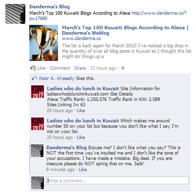 As we say in Kuwait, 3aib. There is no need for you to attack. There is no need for you to be all frustrated. For the love of god its just a list! A bloody list on a blog on the internet! So your blog wasn't on it, big deal! I do NOT take likely to being attacked and if for some reason you are so insecure you think the world is out to get you, it is really and truly not my fault.