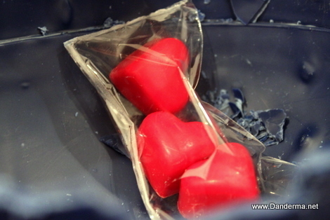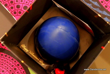 Inside was three red heart chocolates like the one outside filled with liquidy white chocolate. No pictures sorry. Can you take a picture of something that is not there anymore?