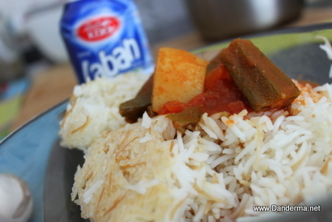 So let me ask you the eternal daily q8y question: 'Shino '3adakom?' I craving a big warm meal: 3eesh Emfalfal with 7akook topped with meatless maraq bamiaya with a bottle of KDD's salty low fat liban. Mmmm ako a7la min el crunchy 7kook ma3a maraq el bamiya eb hal bard?