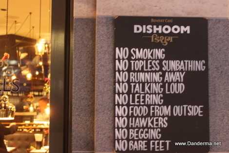 It was an icy cold day when we finally decided to walk inside Dishoom. The air outside was so cold even though it was early evening time at nearly 3 PM. The first thing you notice about the place -from the outside- is the colorful painted bicycles strapped to the poles outside the restaurant and the funny sign.