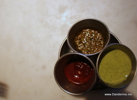 On the table were three sauces: The green one I like, a Tamarind one, and a spicy thing :p