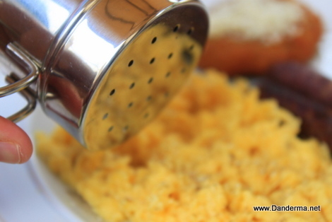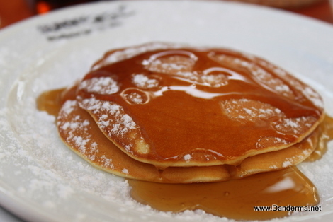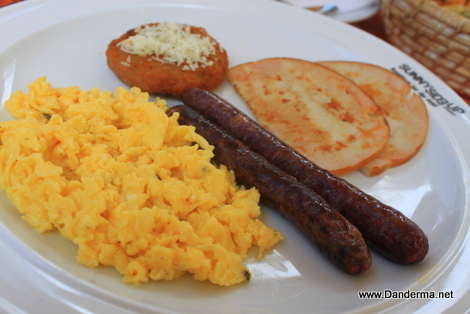My breakfast was the New Yorker: Two scrambled eggs, a hashbrown, Turkey Slices, Sausages, and 2 pancakes. I asked for the Turkey and the Sausages to be on a side plate since I didn't want them touching my vegetarian food -Bu Tootee eats them- but I guess they didn't understand my request.