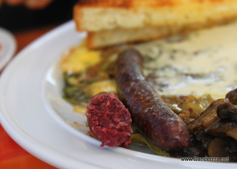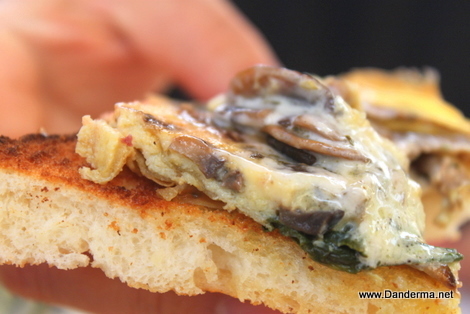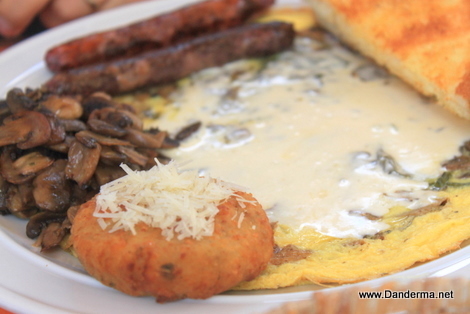 Butootee ordered the Late Miami Omelet. 3 Eggs with spinach and mushrooms covered with a creamy mushroom sauce with a side of Hashbrowns, toast, and sausages.