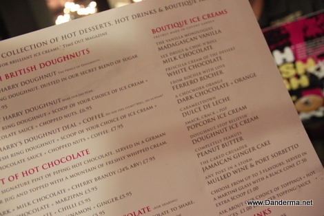 It was one page long. Ice creams come in 3 scoops inside a martini glass -without martini- and you can choose from their current selection. Hot chocolates and ice cream sandwiches have a good share too.