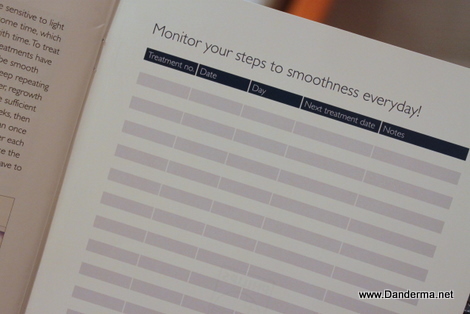 A purple travel bag which I've never used before. My Lumea is kept in a beautiful clear acrylic box of her own like a princess :pand a progress sheet and monitor for you to keep track of your Lumea usage. For best results you must use your Lumea regularly every two weeks on the same spot.