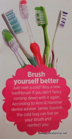 I read this piece of interesting information on Cosmopolitan magazine yesterday and thought I should share it with you. Apparently if you have the flu and you brush your teeth with your toothbrush there is a good chance that the bug lingers on your toothbrush and could possibly come back to reinfect you. 'So its better to throw out your toothbrush and get a new one as soon as you are cured to make sure you don't get infected again!