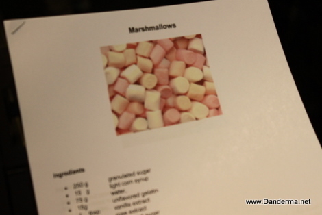 Those who wanted to participate had to put on aprons and chef's hats. We were also handed out printed papers with recipes for Marshmallows, Macaroons, Jujubes Candies, and Glazed Strawberries.