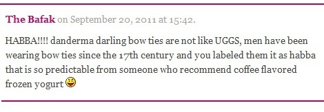 In my "Habba Alert: Men Wearing Bow Ties" post, someone who disagreed with me told me so, BUT, he ridiculed my opinion by making a reference to my liking of coffee flavored frozen yogurt. Shako? Madry wallah 3elmi 3elmkom!