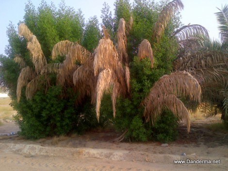 We were driving around last weekend when we saw the strangest hybrid of trees ever. It looks a dead palm tree portruding from a bushy Conocarpus trees! There were a group of them as well. Mo chenna za7ma shway :p