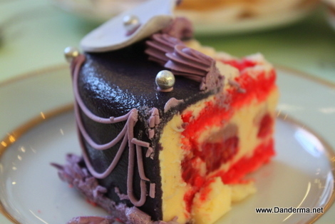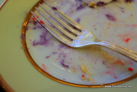 I loved it so much I began eating it only, and concentrated on eating it. I do vaguely recall snippets of conversation on the table: Dudette saying something about someone and Pink Girl chiming in. I was silent and distant, me and my slice of cake in a world of our own, until this happened.