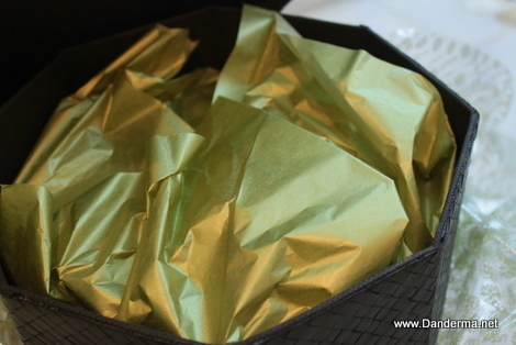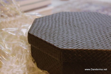 A heavy elegant black woven box with a lid. My mother confiscated it saying she has stuff to put inside :p When you open the lid you will find golden tissue paper.