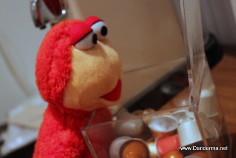 Isn't my baby No3man adorable? I've been playing with him all evening and just now did he settle down to watch me post! Look at him, checking out a tiny perfume bottle.