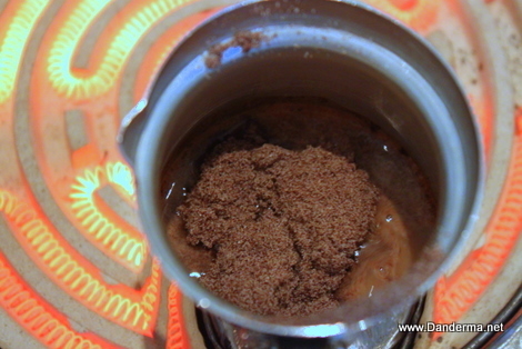 Add the sugar to the coffee and water in the kanaka and mix well.