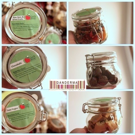 Healthy stuff indeed: three jars with portion size and calorie intake written on top. One Mixed nuts and fruits, one date fingers, and one choco balls. All three have a calorie intake of 150 calories only, perfect for snacking guilt-free!