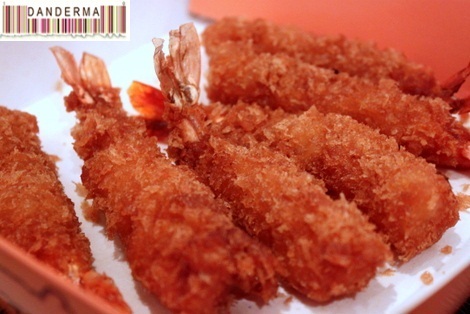 The box contains about 6 pieces of shrimps that are breaded with the Japanese bread crumbs, panko I think they are called? They also come with four different dips.